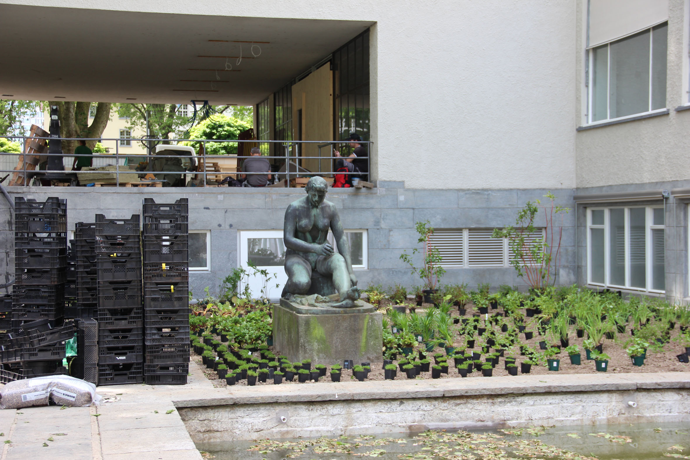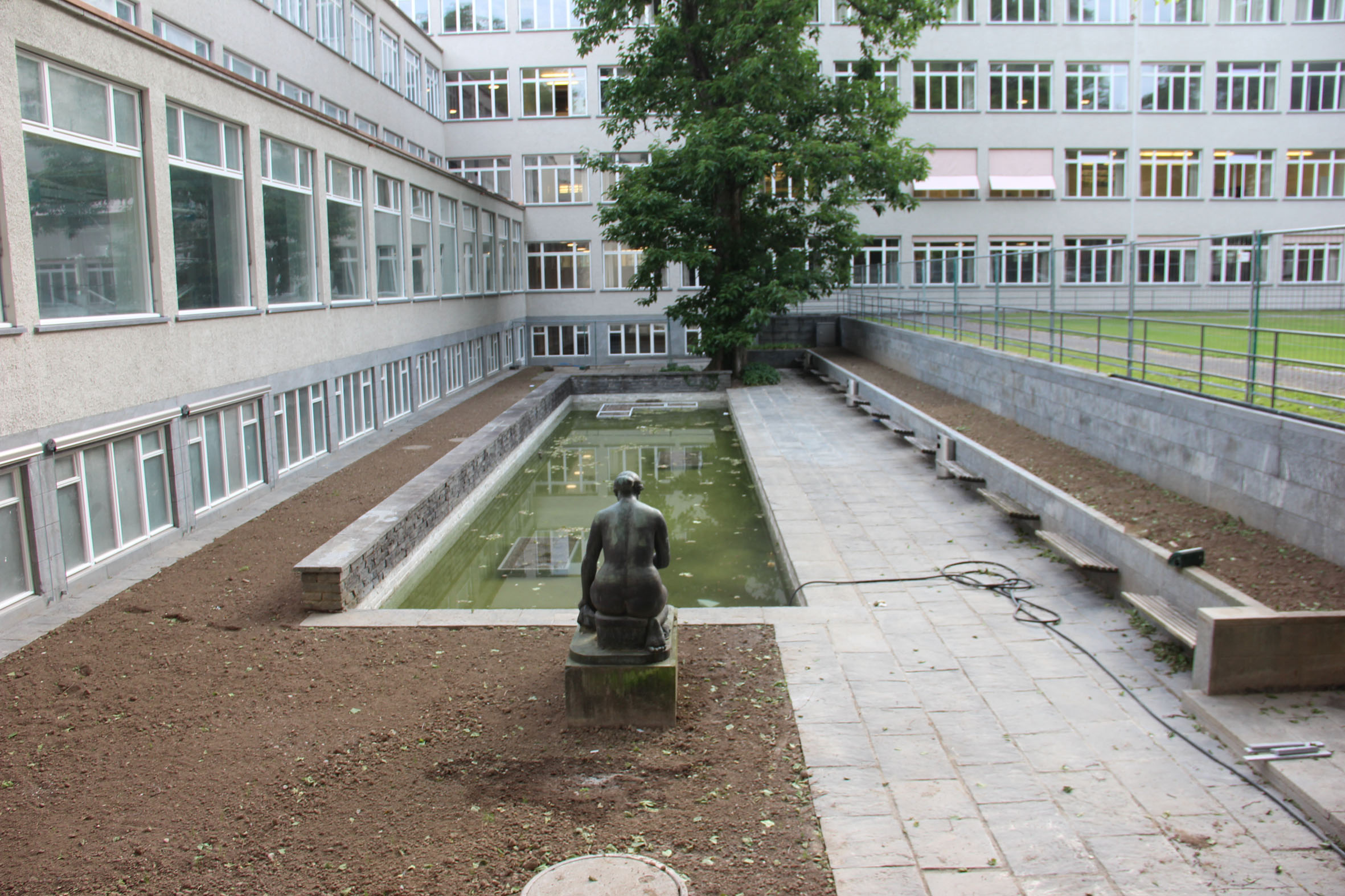 Schöpfung von Gustav Ammann von 1933 zu einem der ersten grossen öffentlichen Bauten der klassischen Moderne Zürichs (Architekten Adolf Steger und Karl Egender). Eine artenreiche Pflanzung begleitete das formale Wasserbecken und nimmt inhaltlich Bezug zum Element Wasser.