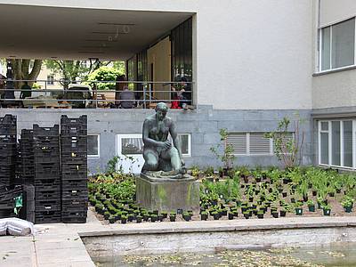 Schöpfung von Gustav Ammann von 1933 zu einem der ersten grossen öffentlichen Bauten der klassischen Moderne Zürichs (Architekten Adolf Steger und Karl Egender). Eine artenreiche Pflanzung begleitete das formale Wasserbecken und nimmt inhaltlich Bezug zum Element Wasser.